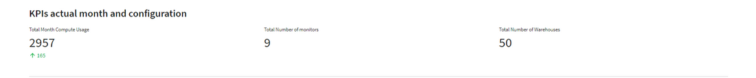 The ‘KPIs Actual Month’ segment comprises three cards. Initially, three columns are established, with each column dedicated to a specific card generated through a SQL query. The initial card displays the ‘Total Month Compute Usage’, this card displays a comparison between the actual month date compared to the previous month. The second card illustrates the ‘Total Number of Resources Monitors’, and the third card shows the ‘Total Number of Warehouses’.